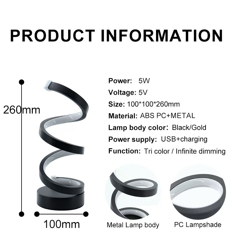 Cette lampe de bureau en spirale innovante est disponible en différentes couleurs et est dotée d'une finition en alliage d'aluminium. Il offre trois options de lumière douce et se vante d'un design artistique minimaliste. Alimentation via USB, il permet un éclairage réglable dans trois teintes différentes, offrant une ambiance chaleureuse et agréable. Idéal pour une utilisation comme lampe de bureau décorative dans les salons, chambres, bureaux, ou des études, il sert à la fois de source lumineuse fonctionnelle et d'œuvre d'art attrayante.