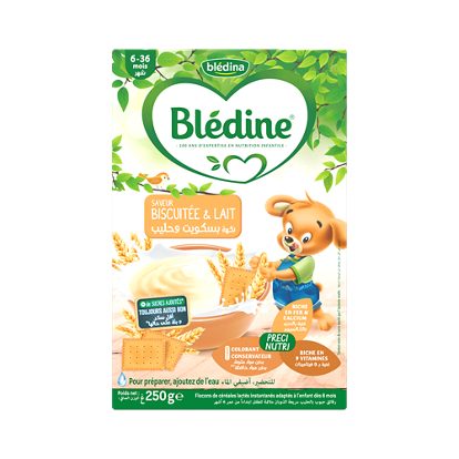 Blédine® Saveur Biscuitée & Lait, une délicieuse recette de céréales lactées et gourmandes pour faire découvrir à bébé, dès 6 mois, le goût du biscuit ! Les céréales de nos recettes Blédine® sont naturelles et sélectionnées spécialement pour bébé.