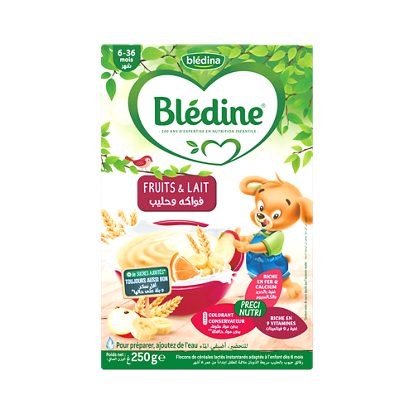 Blédine® Fruits & Lait, une recette de céréales qui allie du bon lait et un délicieux goût de fruits ! Après 6 mois, bébé va se régaler en découvrant nos recettes Blédine® dont les céréales sont naturelles, cultivées avec amour et soigneusement sélectionnées pour lui.