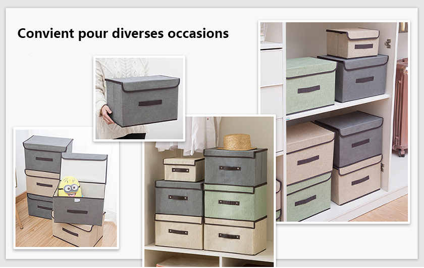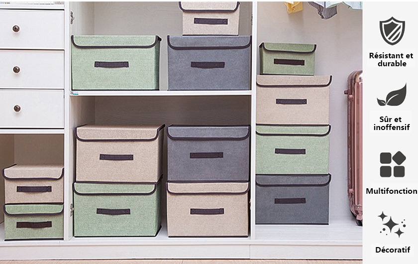 Matériaux de Haute Qualité : Fabriqué en lin premium et en carton durable en polyéthylène non tissé. Sûr, écologique et durable. | Design avec Poignée : Les cubes de rangement pliables sont dotés de poignées pour un accès facile et une portabilité pratique. | Design Pliable : Facilement pliable lorsqu'il n'est pas utilisé, simple à assembler ou à ranger, idéal pour organiser et stocker des objets à la maison. |