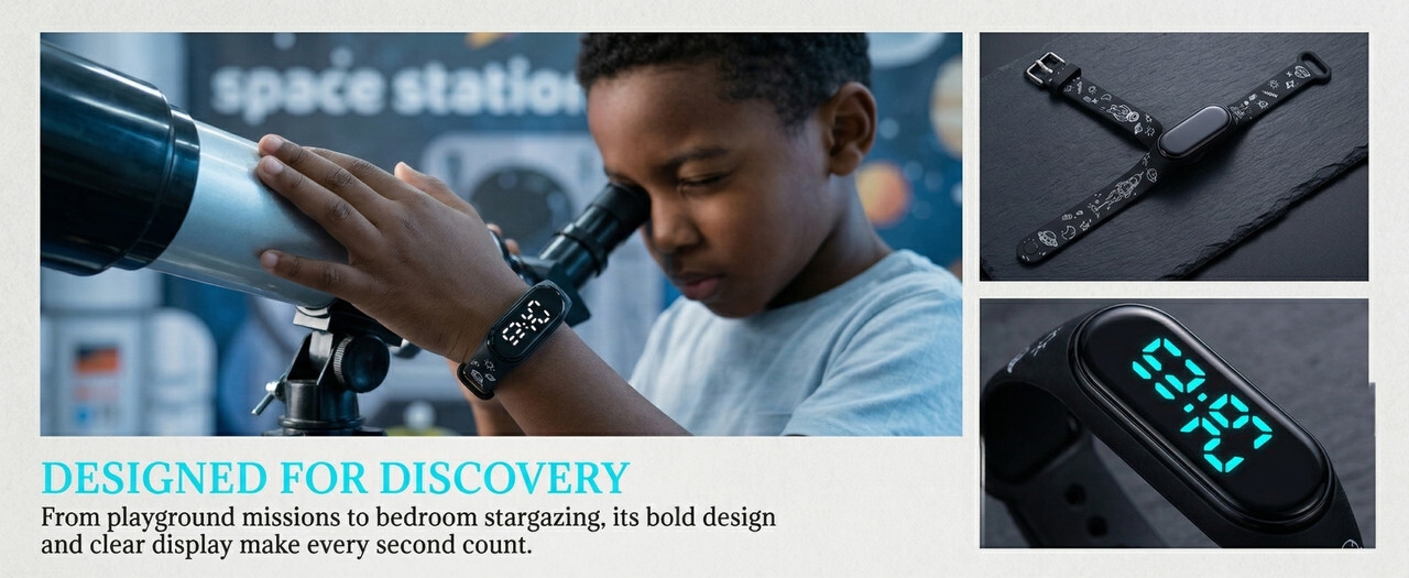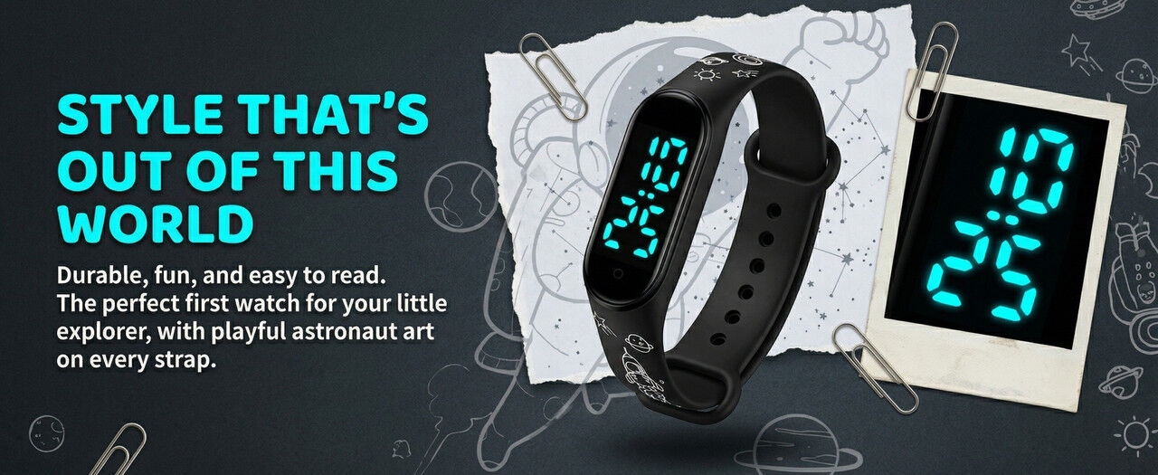 1. Cette montre LED pour enfants présente un design cool à thème astronaute et espace, en faisant un choix passionnant pour les jeunes amateurs de l'espace.