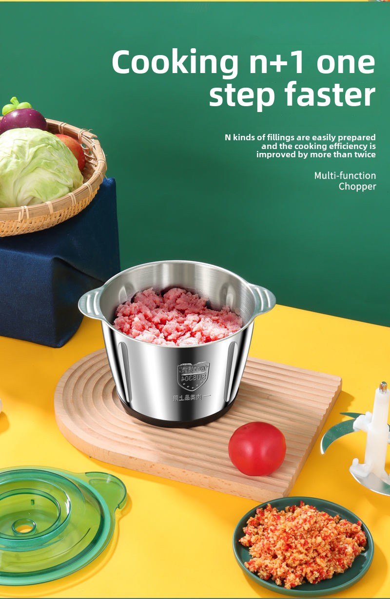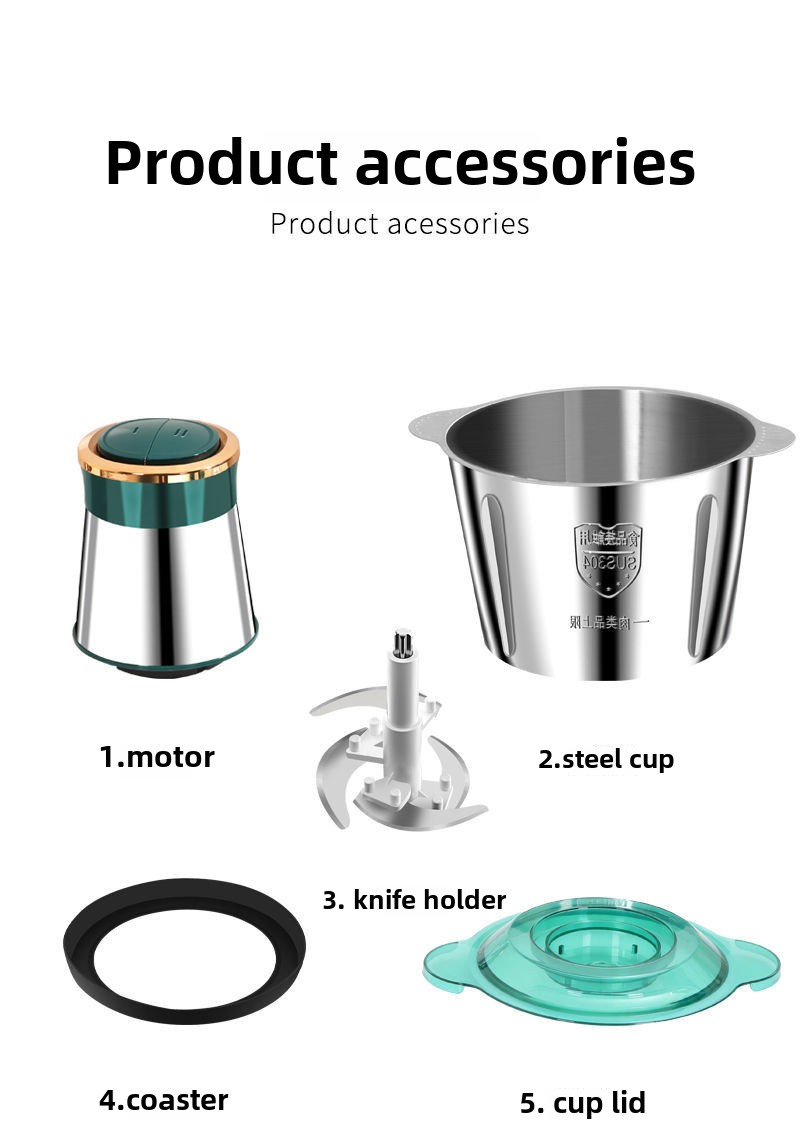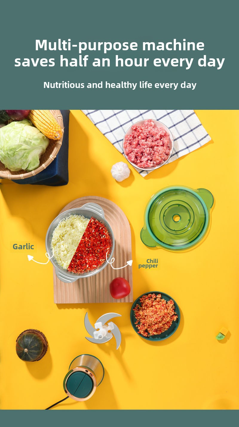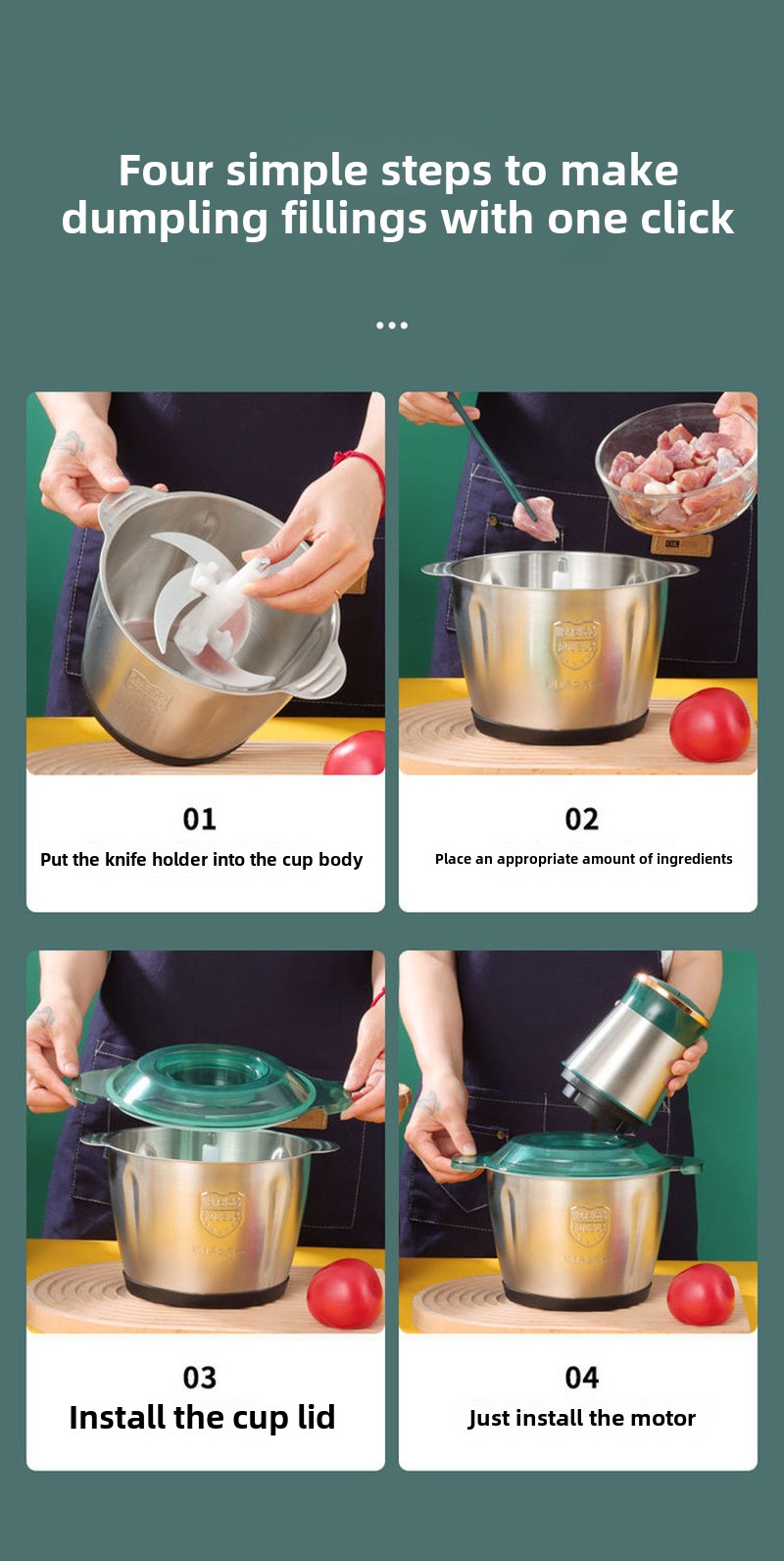 This electric food chopper is designed for user-friendliness. The cup bowl design makes it easy to load ingredients and operate with one touch. After use, the parts are easy to clean—simply remove the blades and wash the bowl and lid for hassle-free maintenance.