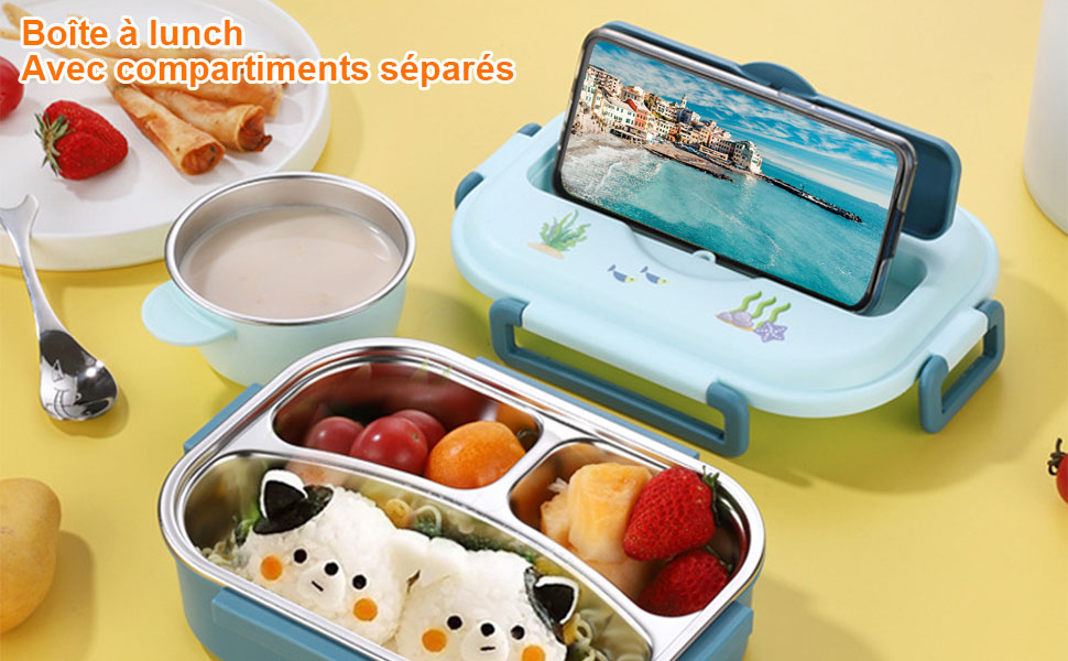 Boîte à déjeuner en acier inoxydable 304, à 3 compartiments pour élèves de l'école primaire avec bol, boîte à déjeuner pratique, mignon