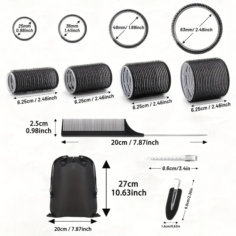 [Contenu] Ce coffret de fers à boucler comprend 24 bigoudis noirs auto-agrippants de quatre tailles différentes, 24 pinces et une pochette de rangement. Idéal pour créer du volume et des boucles volumineuses sur cheveux longs, moyens et courts, y compris les franges épaisses. Ne convient pas aux cheveux fins, fins ou très raides.