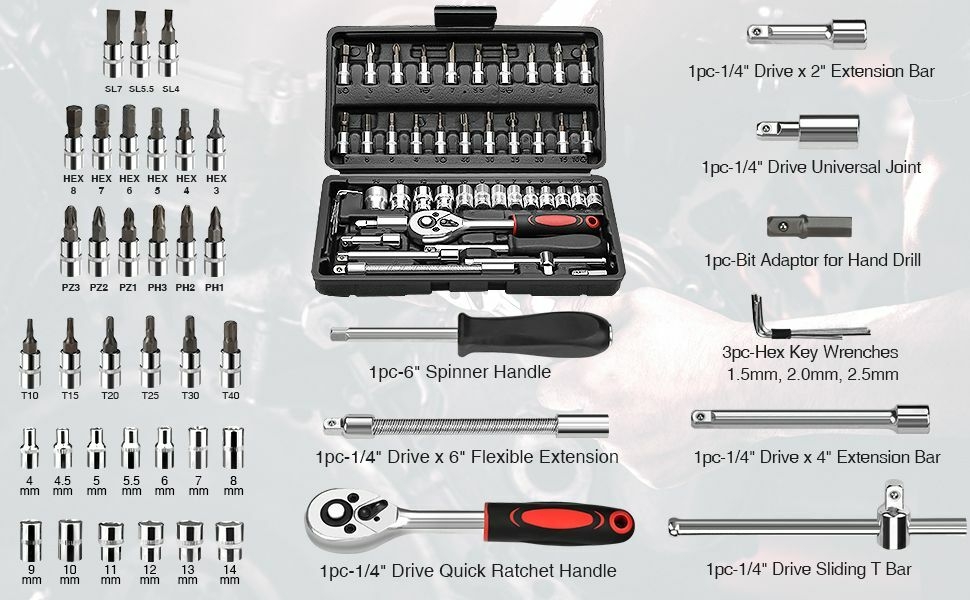 ♞ Contenu du jeu de clés à douille : 21 embouts rotatifs, 123 clés cruciformes et 45,57 clés plates ; 345,678 clés hexagonales ; 3 clés hexagonales T10, T15, T20, T25, T30, T40 ; 3 clés hexagonales : 1,5, 2 et 2,5 mm ; 1 douille métrique 1/4" : 4, 4,5, 5, 5,5, 6, 7, 8, 9, 10, 11, 12, 13 et 14 mm. 3 raccords multidirectionnels 1/4" ; 1 cliquet 1/4" ; 1 barre d'articulation courte 1/4" (50 mm) ; 1 petite barre carrée 1/4" (140 mm) ; 1 barre de connexion longue 1/4" (100 mm) ; 1 barre flexible 1/4" (140 mm) ; 1 coulisseau 1/4" (140 mm) ; 1 tête pivotante motorisée 1/4" AD.