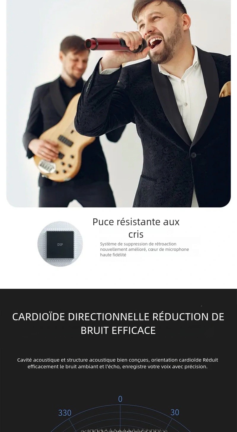 Pour un anniversaire, un mariage ou une fête communautaire, ce microphone sans fil double permet à deux personnes de chanter ou parler en même temps.