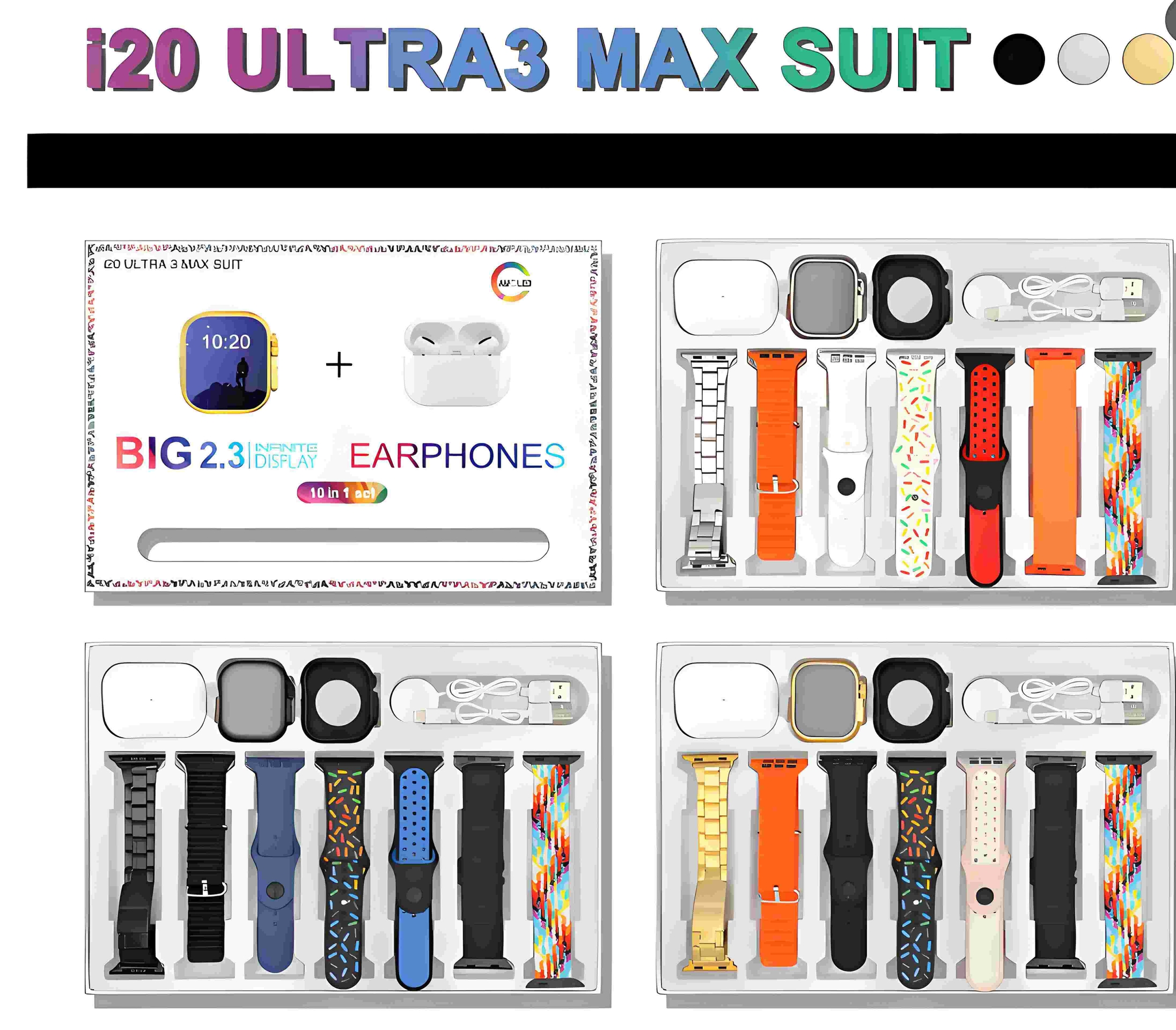 Découvrez le pack i20 ultra Max suit , un coffret technologique complet qui allie style , performance et praticité . profitez d'une montre connectée grand écran 2.3" infinite display et d'écouteurs sans fil Bluetooth pour rester connecté et profiter d'un son de qualité où que vous soyez . parfait pour le sport , travail , les voyages ou la vie quotidienne , ce pack réunit tout ce qu'il vous faut dans une seule boite