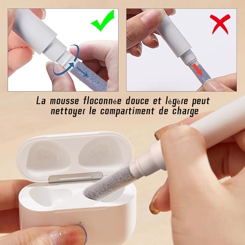 【NOUVELLE TECHNOLOGIE】 Vous utilisez encore des écouteurs sales ? Vous utilisez encore ces outils de nettoyage encombrants ? Notre kit de nettoyage est un stylo qui permet de nettoyer l’ensemble des écouteurs Bluetooth, depuis les petits trous des écouteurs jusqu’à la boîte de chargement, nettoyage à 360° sans angle mort, rendant vos écouteurs plus durables.