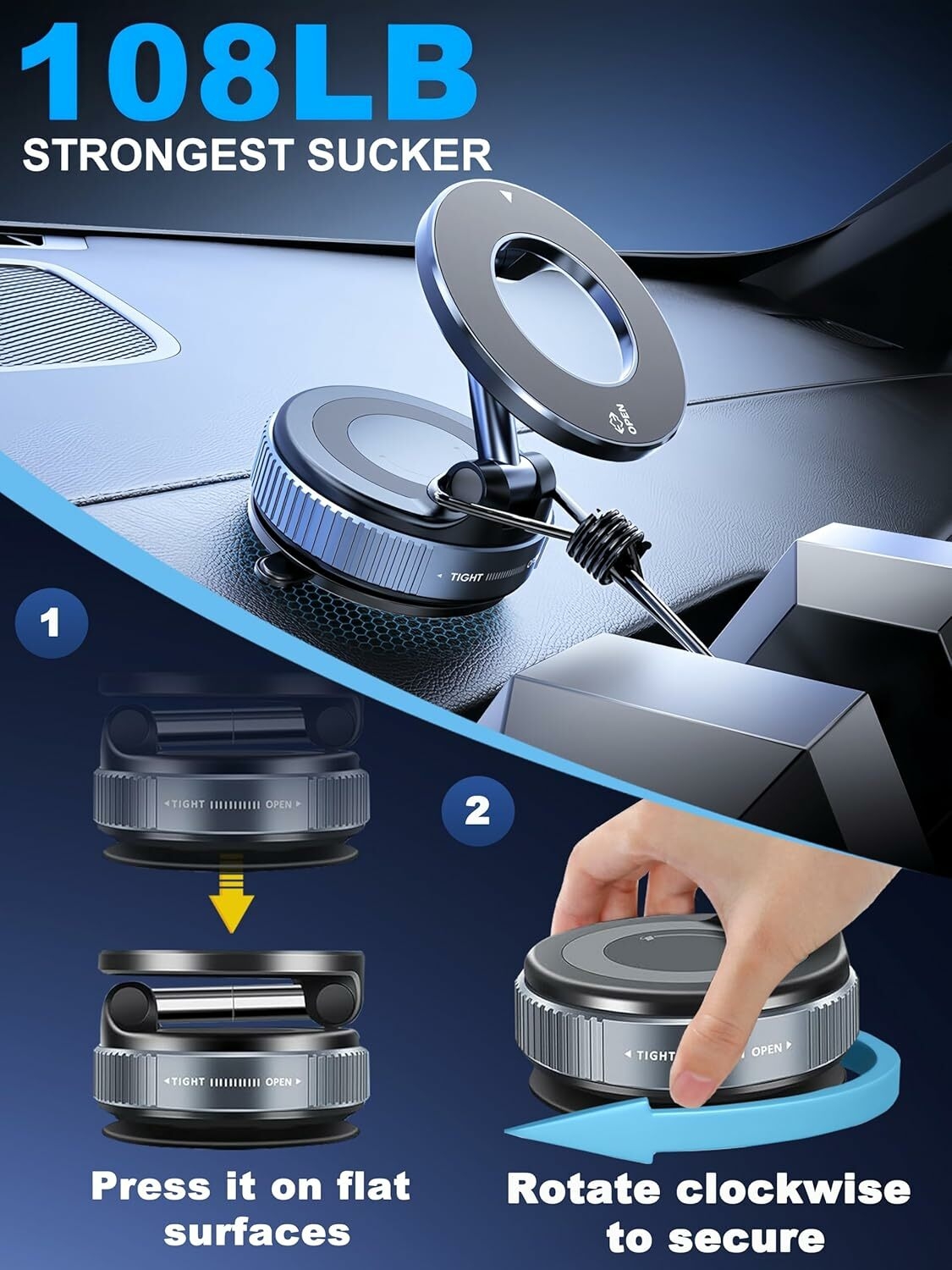 【Strong Suction & Secure Hold】This car phone mount features advanced twist-lock vacuum suction, delivering 65% stronger grip than traditional push-style mounts—keeping your phone steady even on bumpy roads or during sudden stops. Its 4-layer ultra-strength nano gel pad can hold up to 120 lbs and stays firmly in place in extreme temperatures (–40°F to 300°F). Rigorously tested over 10,000 durability cycles and 500+ reattachment tests, it retains 99% of its suction power after cleaning, ensuring long-lasting stability.
