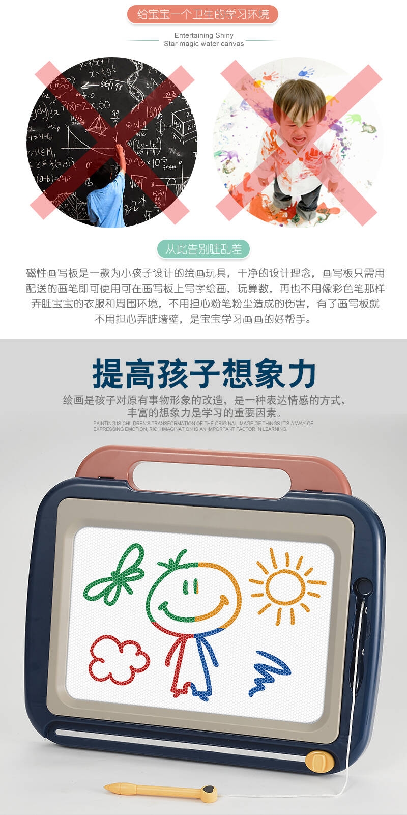 [Tableau à dessin coloré] Disponible en quatre couleurs : bleu, vert, rouge et jaune, ce tableau permet de créer facilement des dessins colorés grâce aux feutres et tampons magnétiques inclus. Il contribuera au développement de l'imagination et de la créativité de votre enfant. [Grand tableau à dessin]