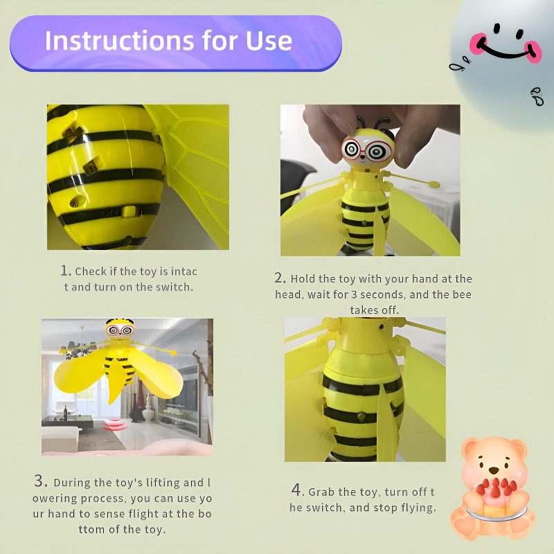 1. À l'extérieur, vous devez choisir un vaste endroit pour jouer, les mains ne peuvent pas être placées sous le jouet tout le temps pendant le jeu, évitez de détecter tout le temps le jouet qui s'envole.