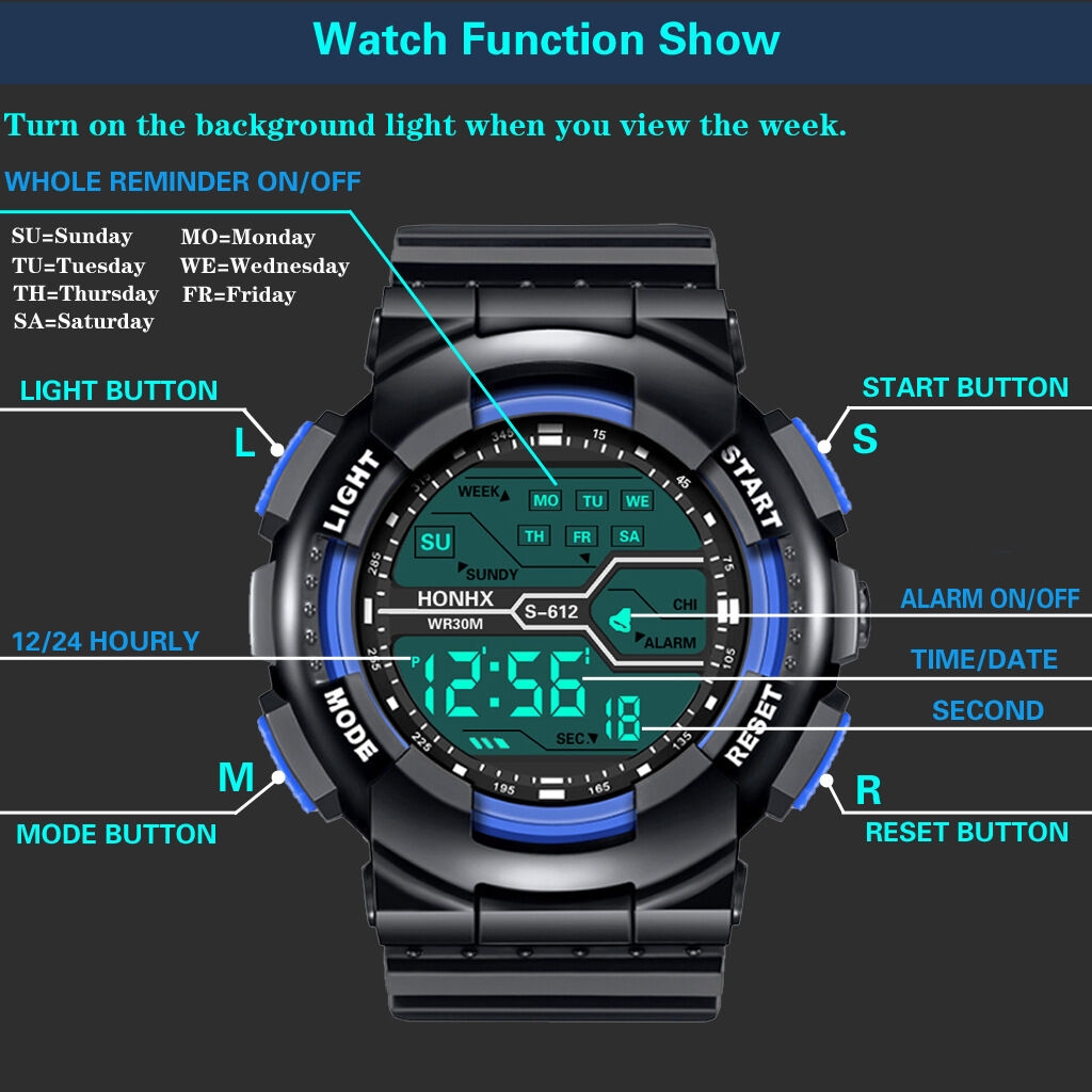 --Multifonction : affichage de l'heure, chronomètre, rétroéclairage, affichage de la date, affichage de la semaine, réveil chronométré, 12/24 heures, étanche, résistant aux chocs,