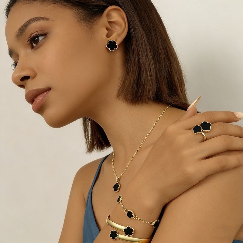 Ensembles de bijoux tendance pour femmes Version coréenne du nouveau 【Ensemble de 5 pièces】 Boucles d'oreilles porte-bonheur à cinq pétales + collier + bracelet + bracelet + ensemble de bagues Ensembles de bijoux à cinq pétales