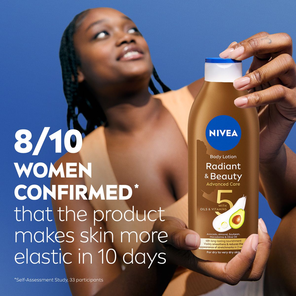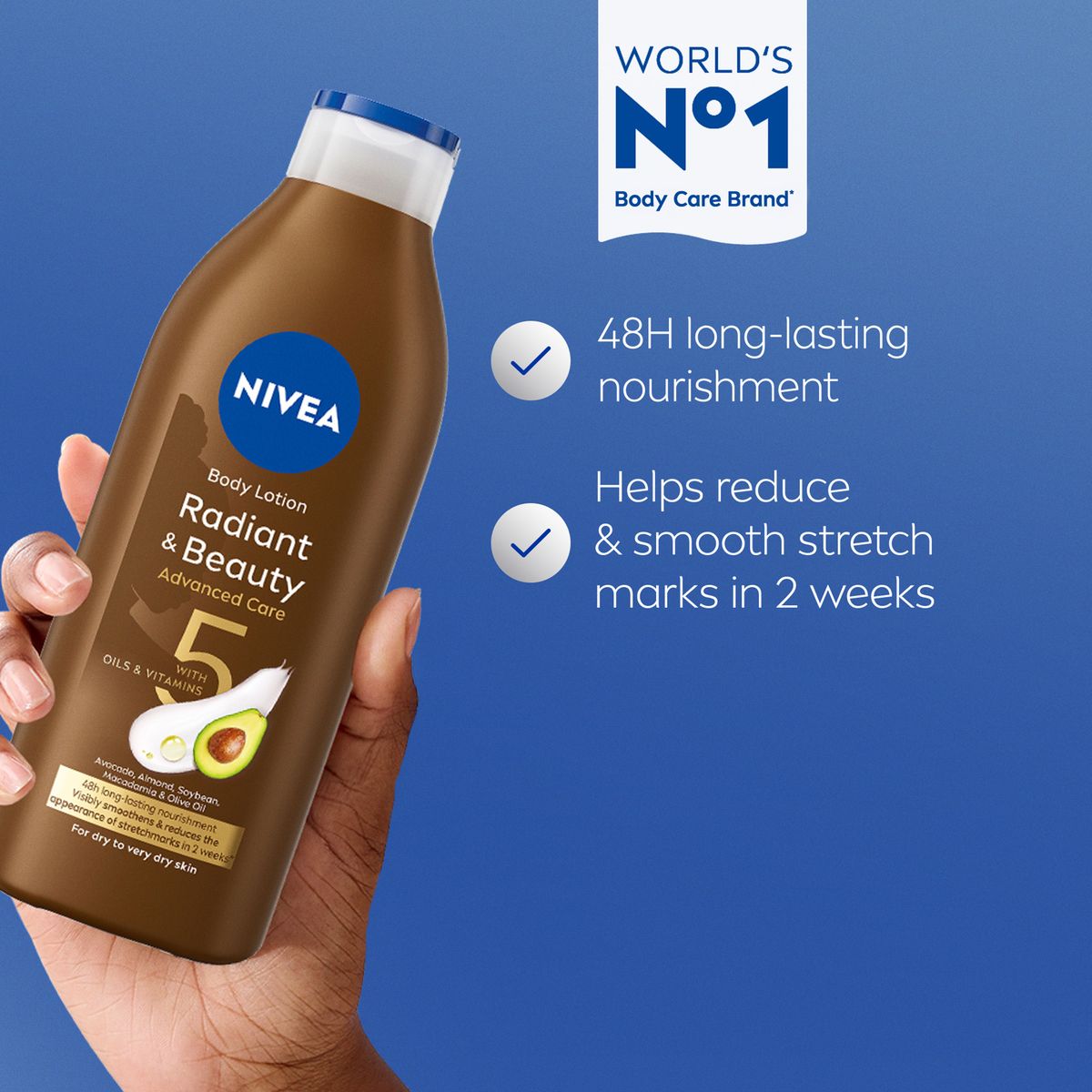 En plus de fournir 48 heures d'hydratation en profondeur, la crème hydratante pour le corps NIVEA Radiant Beauty Intense Care aide à réduire les vergetures en deux semaines d'utilisation continue.*Test de perception. Les résultats dépendent de l’utilisation continue du produit.