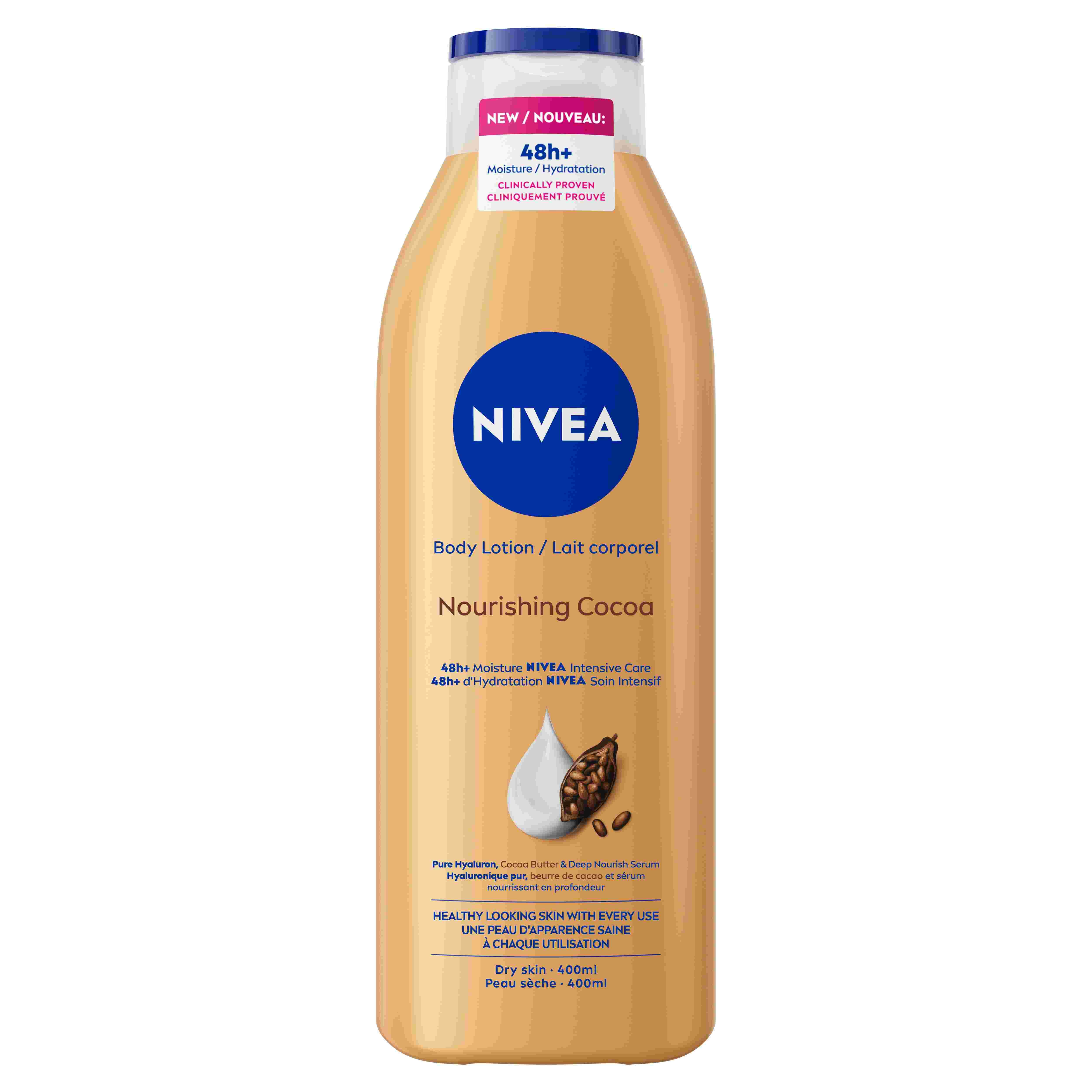 Le lait corporel nourrissant au cacao NIVEA offre une hydratation intense pendant 48 h et une peau visiblement plus douce. Sa formule brevetée repose sur le principe que la peau contient naturellement une hydratation suffisante dans ses couches profondes. La composition unique de ce lait, enrichie en lipides hydratants et en huiles nourrissantes, fixe l'eau dans la peau, empêchant ainsi son évaporation. La peau est ainsi protégée du dessèchement grâce à une réduction de la perte en eau et une hydratation optimale. Des tests récents ont démontré que l'association parfaite d'ingrédients de haute qualité, présents dans nos laits corporels et nos lotions, et du sérum hydratant intense, pénètre profondément dans la peau, la maintenant hydratée pendant 48 heures. Un résultat visible et ressenti.