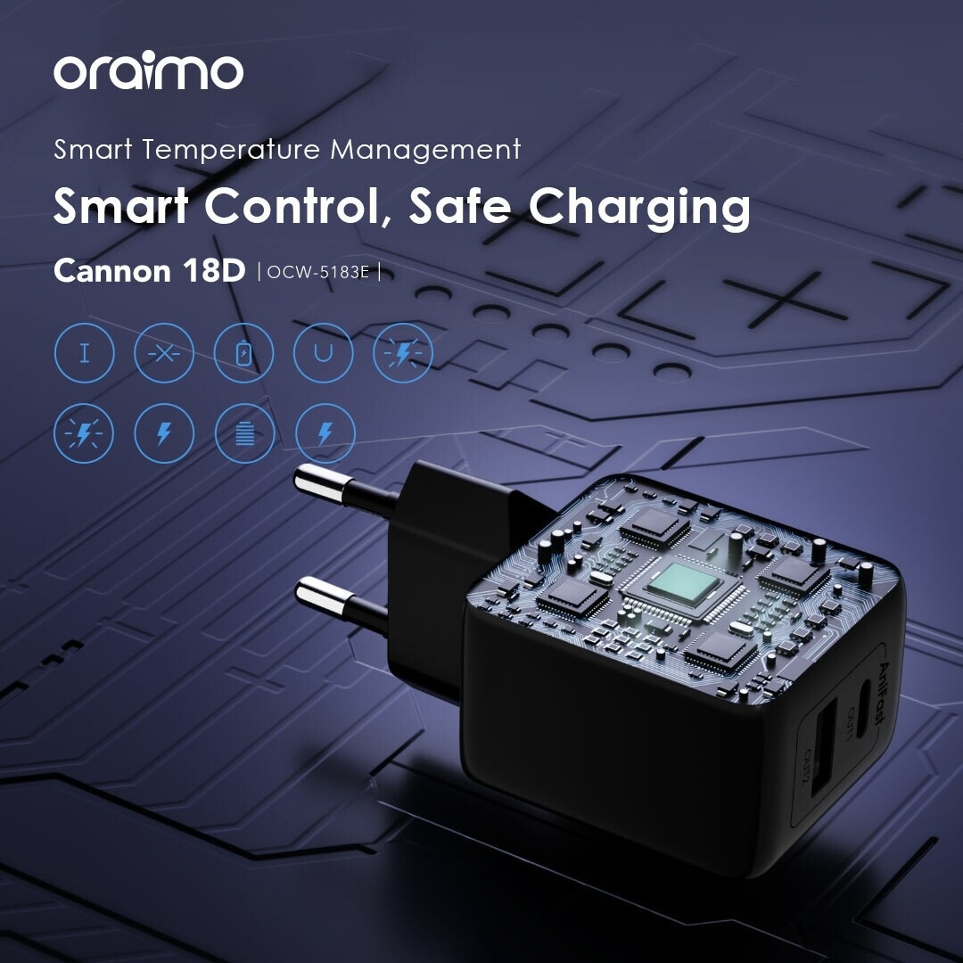 oraimo 18D surveille et régule activement la température, garantissant que vos appareils se chargent dans des conditions optimales tout en évitant la surchauffe. Profitez d'une charge plus sûre et plus efficace.
