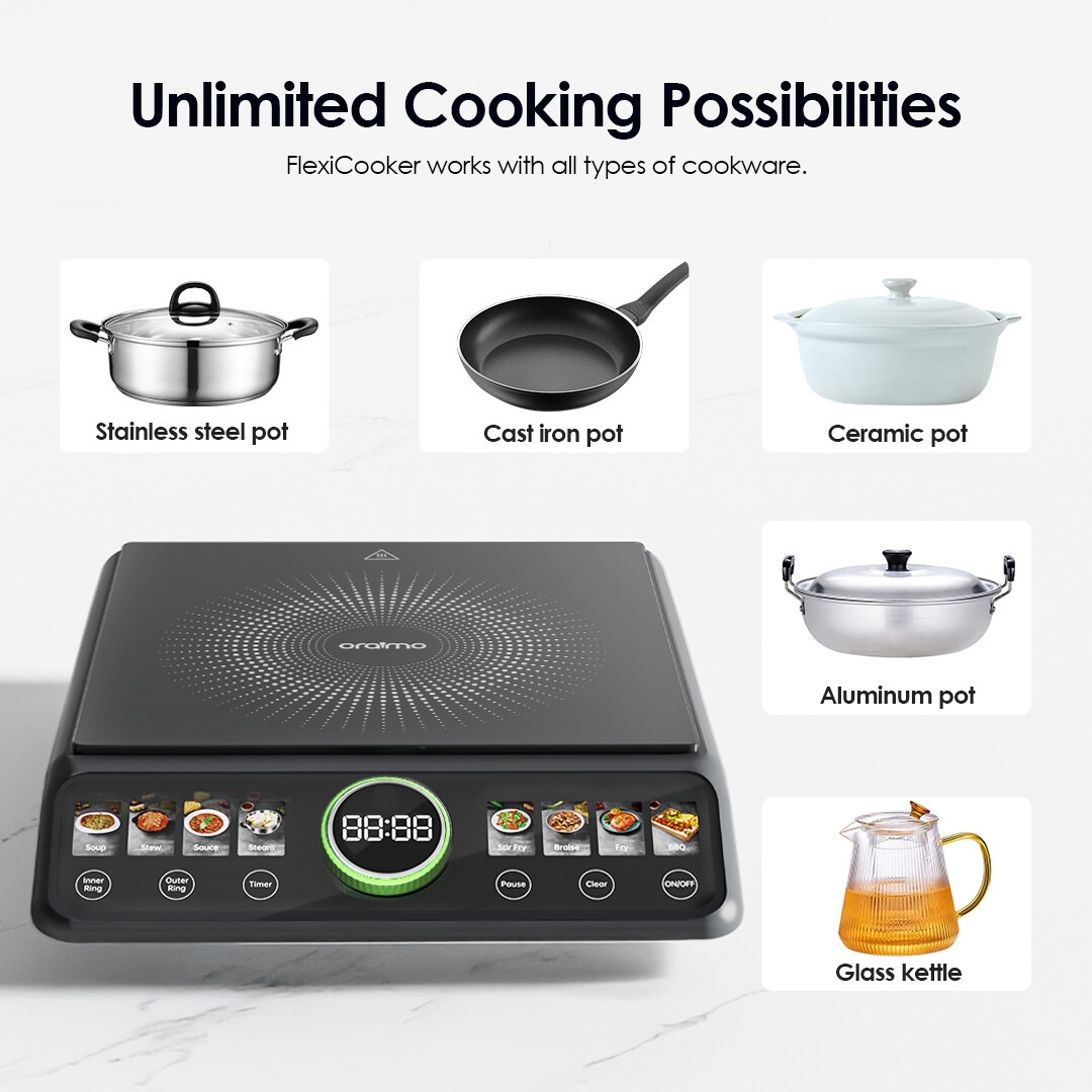 Zones de chaleur flexibles pour chaque plat. Ajustez entre les anneaux intérieur et extérieur pour s'adapter parfaitement à la taille de vos ustensiles de cuisine.