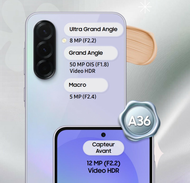 Le module photo du Galaxy A36 5G mise sur la polyvalence avec un triple capteur principal, emmené par un objectif de 50 MP stabilisé optiquement (OIS).
