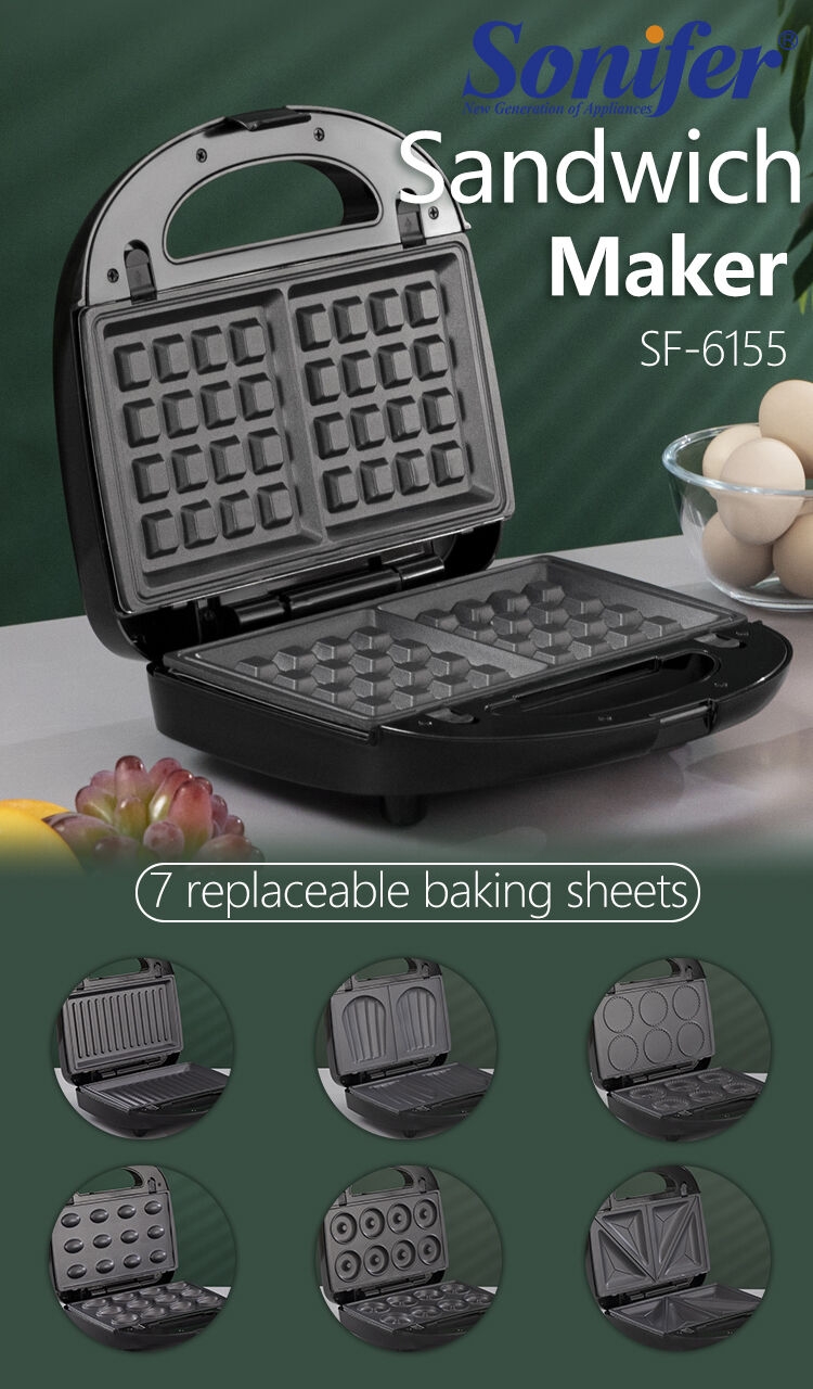 L'appareil multifonction Sonifer SF-6155 est équipé de sept paires de moules métalliques interchangeables avec revêtement antiadhésif de haute qualité : un moule « gaufres viennoises », un moule « grill », un moule « noix », un moule « donuts », un moule « churros » et deux moules « sandwichs » pour sandwichs chauds. Puissance : 750 W. Commandes : mécaniques. Chauffage : automatique. Forme des moules : carrée. Nombre de compartiments : 2. Types de moules amovibles : 7.