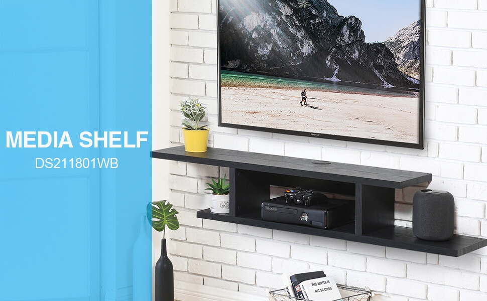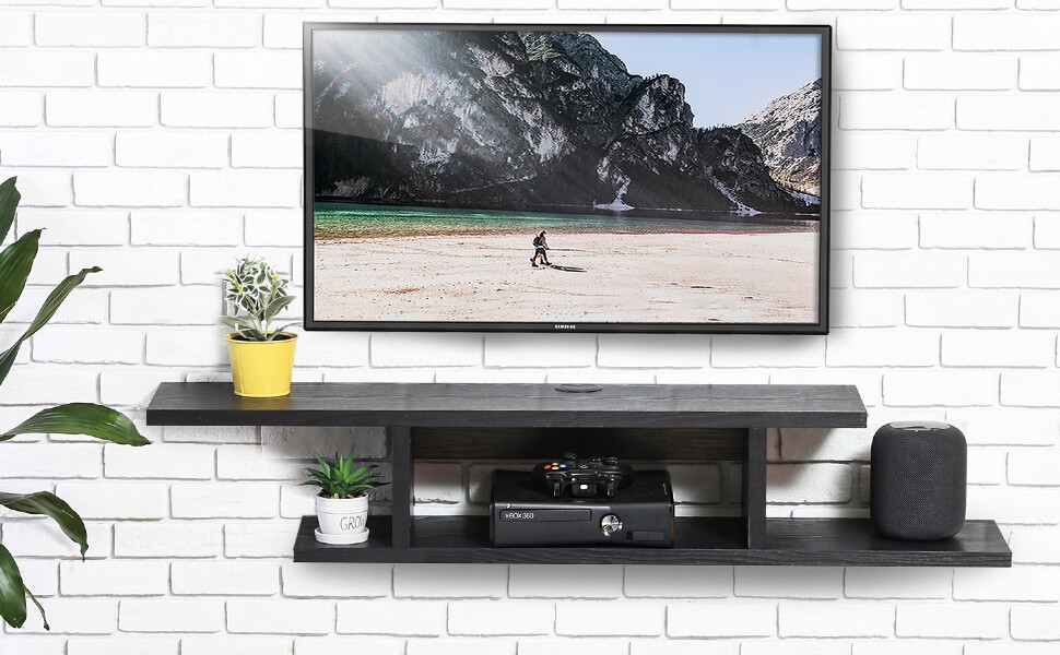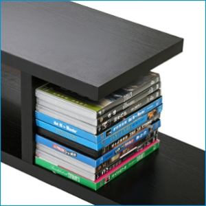 Haute qualitéCe support est en MDF avec protection des bords. | Gestion des câbles2 trous de câbles sont conçus pour cacher les câbles en désordre. Gardez vos affaires bien rangées. | Espace de rangementIl y a deux espaces ouverts à côté: les CD, les DVD et les jeux vidéo. |