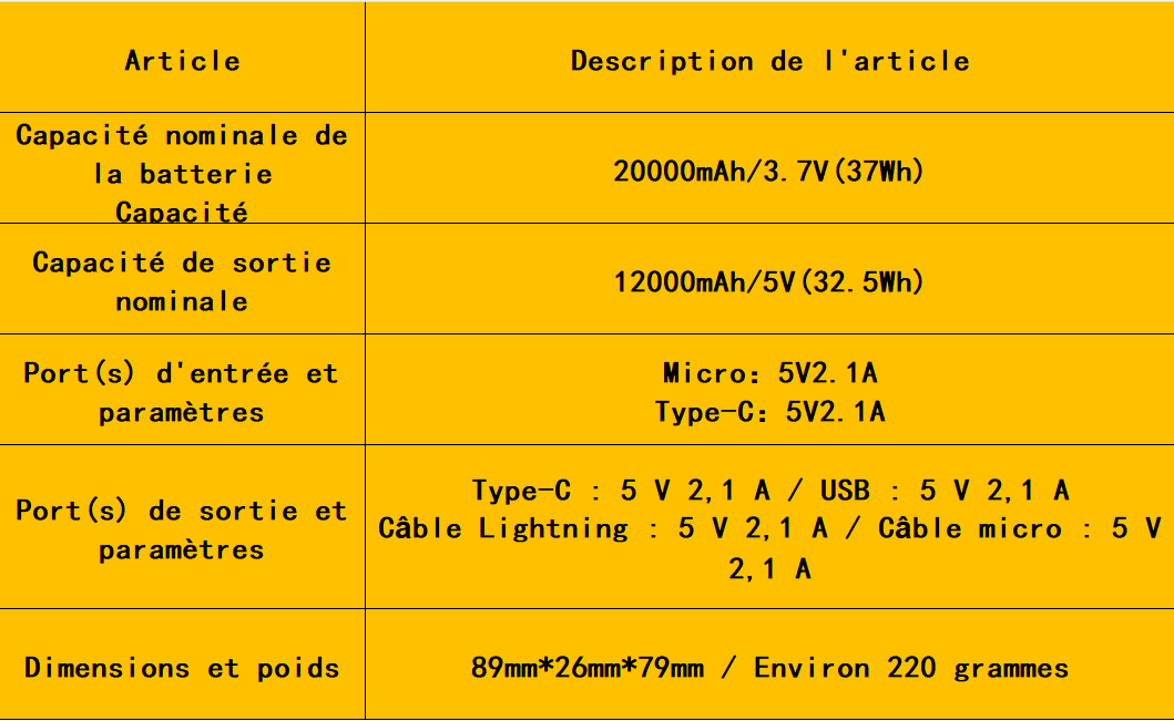 ● Exemple : une batterie externe d'une capacité nominale de 20 000 mAh fournira environ 12 000 à 14 000 mAh de capacité de charge utilisable pour les appareils (les valeurs réelles varient en fonction de l'appareil et des conditions d'utilisation).