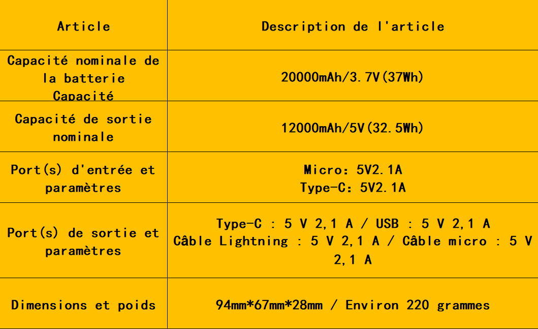 ● Exemple : une batterie externe d'une capacité nominale de 20 000 mAh fournira environ 12 000 à 14 000 mAh de capacité de charge utilisable pour les appareils (les valeurs réelles varient en fonction de l'appareil et des conditions d'utilisation).