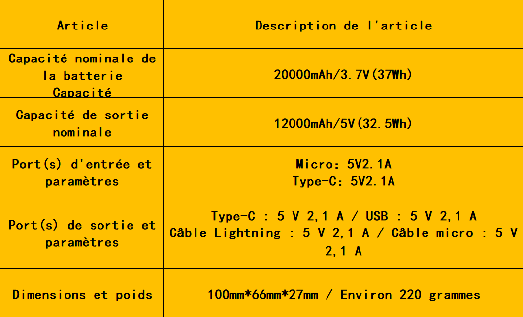 ● Exemple : une batterie externe d'une capacité nominale de 20 000 mAh fournira environ 12 000 à 14 000 mAh de capacité de charge utilisable pour les appareils (les valeurs réelles varient en fonction de l'appareil et des conditions d'utilisation).