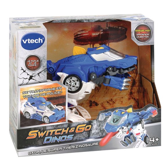 Switch & go Dinos : Oxor super thérizinosaure de Vtech est une voiture de police qui se transforme en un féroce dinosaure. En mode Dino, le bouton jaune Action fera bouger les pattes ou la mâchoires du dinosaure. Grâce au bouton Commande vocale, votre enfant découvrira des informations intéressantes sur le Thérizinosaure.