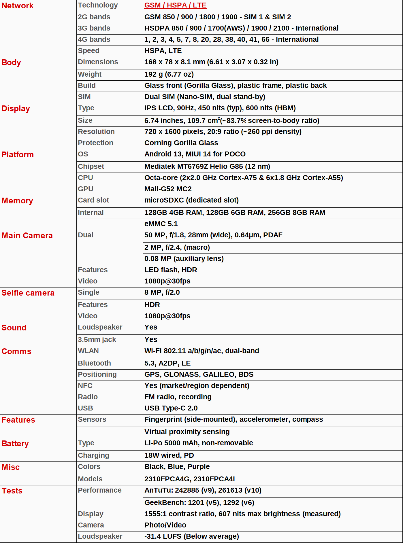 The dual nano SIM-supported Xiaomi oco C65 sports a 6.74-inch HD+ (1,600 x 720 pixels) display, with a refresh rate of 90Hz and an aspect ratio of 20.6:9. The display is protected with Corning Gorilla Glass. The phone runs Android 13-based MIUI 14 for Poco. The chipset in the newly launched Poco C65 is paired with an ARM Mali-G52 2EEMC2 GPU. In the camera department, a dual rear camera unit is available on the Poco C65, which includes a 50-megapixel primary sensor with an aperture of f/1.8, and a 2-megapixel sensor with a macro lens and an aperture of f/2.4. The front camera, placed in a centre-aligned waterdrop notch, is an 8-megapixel sensor with an aperture of f/2.0.Poco has packed a 5,000mAh battery in the Poco C65 with support for 18W wired fast charging via a micro USB port. The phone also offers 4G VoLTE, Wi-Fi, Bluetooth 5.1, GPS, and GLONASS connectivity. It also comes with a 3.5mm audio jack and FM radio support. For security, the handset is equipped with a side-mounted fingerprint sensor. Weighing 192 grams, the handset measures 168mm x 78mm x 8.09mm in size.